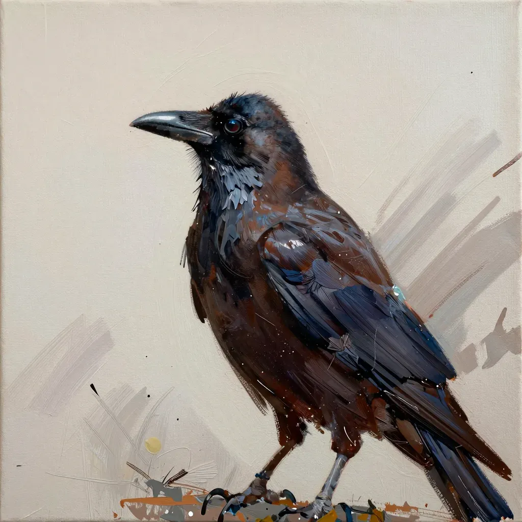A crow with glossy, wet plumage perches gracefully, its feathers reflecting light and creating a soft, velvety texture. The diffused lighting highlights the intricate details of the bird's feathers, casting gentle shadows against a muted beige background with subtle brushstrokes, adding depth and atmosphere.