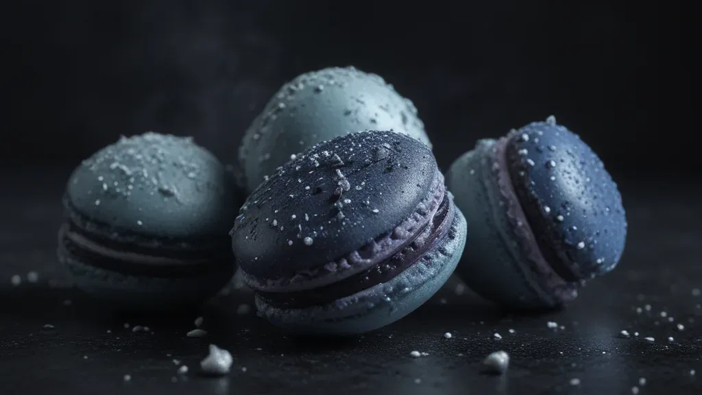 A cluster of dark blue macarons with fine sugar or glitter specks, softly glowing under diffused light, creating a delicate and luxurious visual. The shallow depth of field and dark background emphasize the macarons, making them the focal point of the image.
