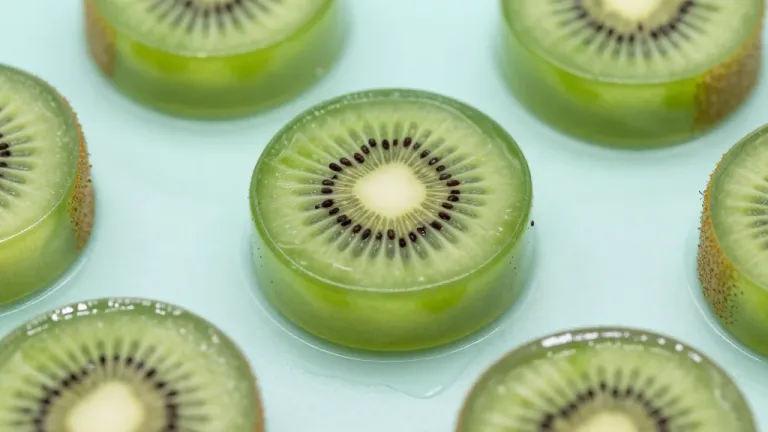 A close-up view of sliced kiwi fruit arranged in a grid pattern, showcasing their glossy, juicy, and slightly translucent texture under soft, diffused lighting that creates gentle shadows. The light blue background provides a clean and simple backdrop, emphasizing the vibrant green color and brown skin of the kiwi slices.