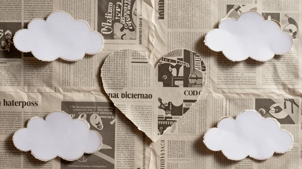 Cloud shapes cut from cardboard are arranged on a crumpled newspaper with diffused, soft lighting. The scattered and overlapping clouds create a textured, artistic composition against the blurred background of the newspaper.