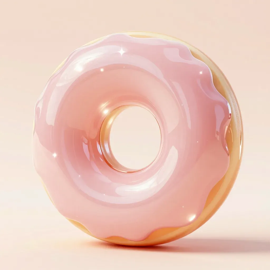 A close-up of a glossy pink donut ring with a creamy texture, illuminated by direct overhead lighting that creates soft reflections and subtle shadows. The blurred light peach background ensures the focus remains on the donut's inviting, warm tone and detailed texture.