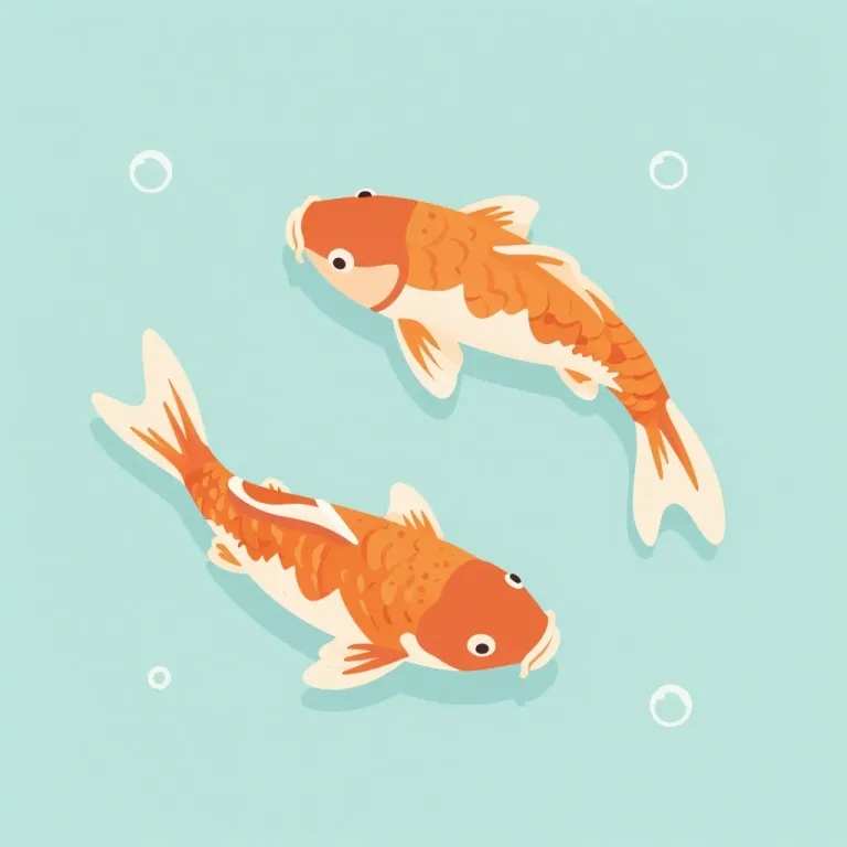 Two koi fish gracefully swim in a light blue water, their glossy scales reflecting soft, diffused light. The simple background ensures the focus remains on the fluid motion and vibrant colors of the fish.