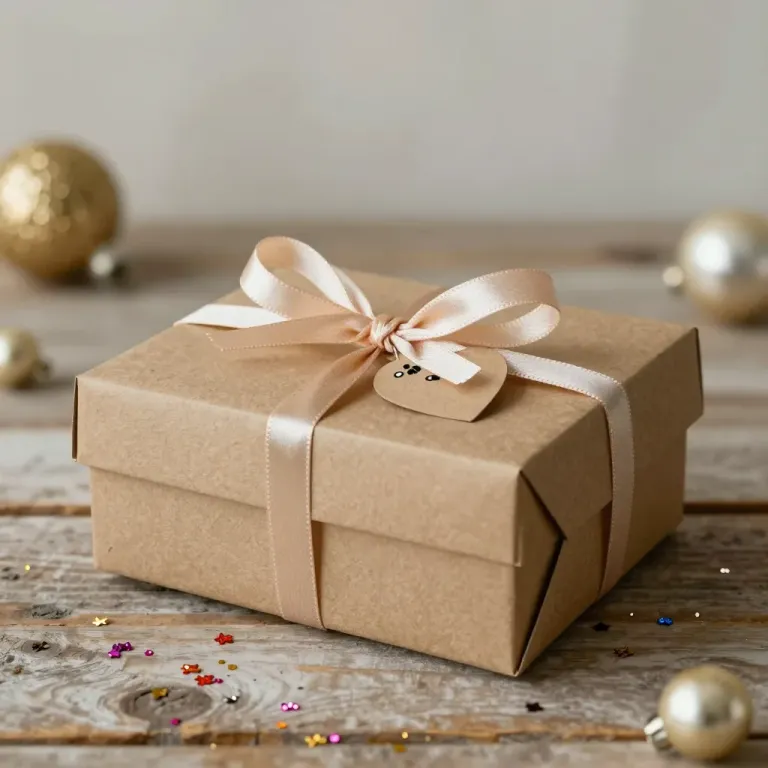 A beautifully wrapped gift box in brown kraft paper with a creamy ribbon and a heart-shaped tag, set against a softly lit, rustic wooden background with scattered ornaments and glitter, creating a festive and cozy ambiance. The diffused lighting highlights the textures of the paper and ribbon, while the scattered ornaments add depth and context to the scene.