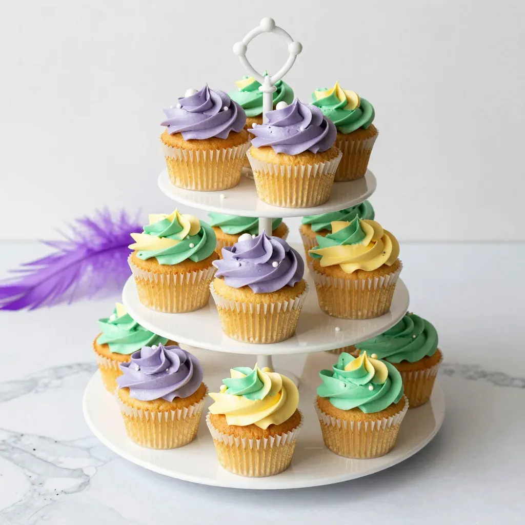 A tiered cupcake stand displays cupcakes with smooth, glossy frosting in vibrant purple, green, and yellow hues, set against a clean white marble background with a blurred feather decoration. The soft, diffused lighting highlights the texture and glossy finish of the cupcakes, creating a visually appealing and balanced composition.