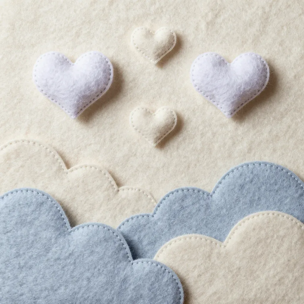 A loose cluster of felt hearts in varying sizes and colors, softly lit with natural, diffused light, creating gentle shadows and highlights. The neutral, textured background complements the soft, fuzzy texture of the felt hearts, offering a clean and minimalistic backdrop.