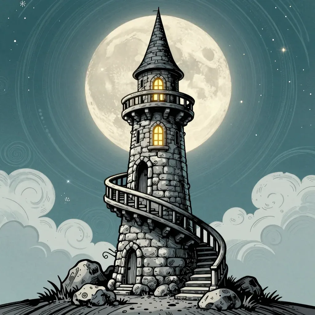 A majestic spiral stone tower with a glowing interior stands under a full moon, casting a soft glow on the surrounding clouds. The composition creates a sense of grandeur and isolation, with the starry sky and swirling clouds adding depth and vastness.