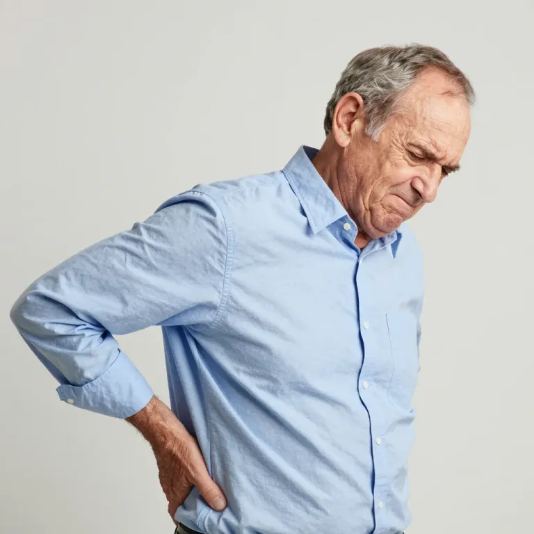 An elderly man in a light blue shirt leans forward with his hand on his lower back, suggesting discomfort or pain. The soft, even lighting and shallow depth of field create a focused, intimate portrait against a plain, neutral gray background.