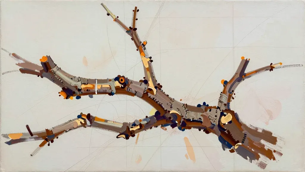 Rough, gnarled branches with circular nodes spread out in all directions, creating a sense of depth and movement against a neutral white background. The diffused lighting highlights the texture and adds a soft, natural feel to the composition.