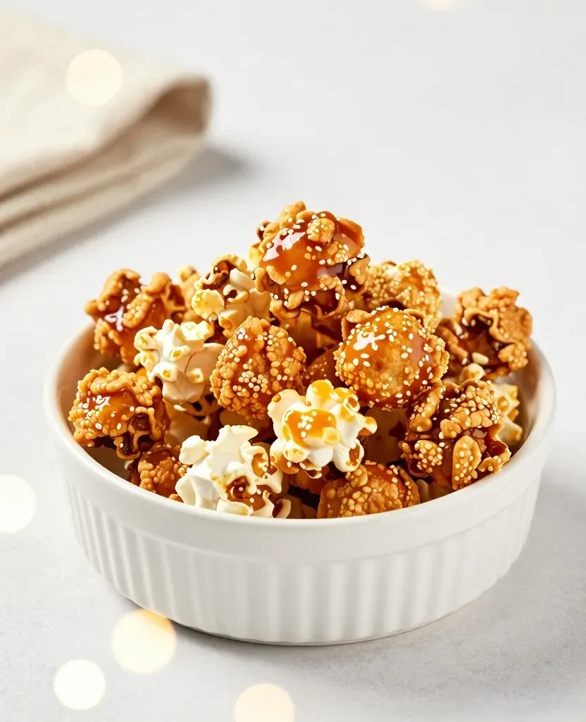 Glossy caramel-coated popcorn with crunchy sesame seeds and fluffy white kernels overflows from a ribbed ceramic ramekin, creating a rich textural contrast. Soft diffused overhead lighting with warm highlights and shallow depth of field isolates the subject against a blurred neutral grey background with bokeh accents.