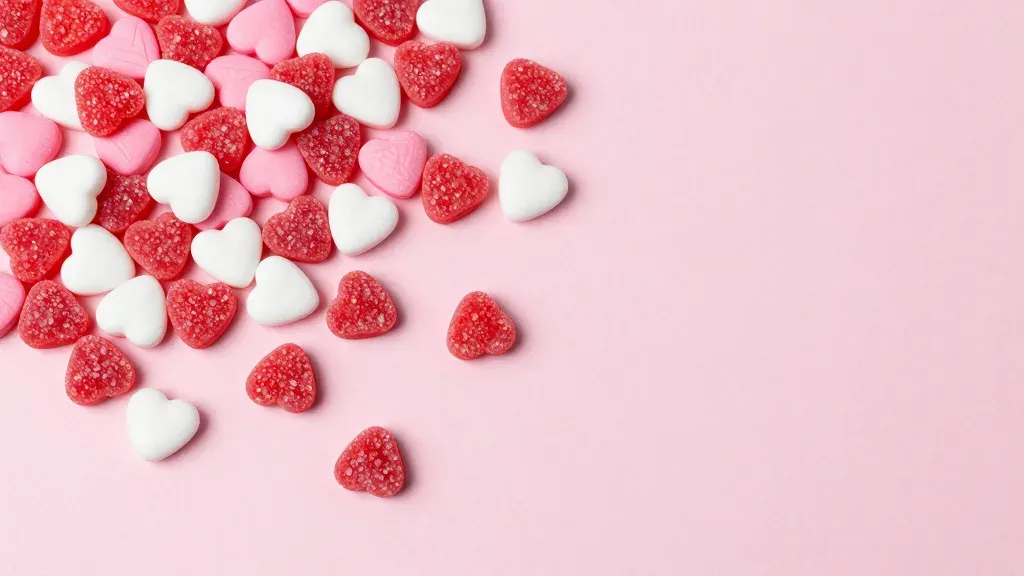 A cluster of red, pink, and white heart-shaped candies with a sugary crystalline texture rests diagonally across a soft pink surface, catching soft overhead light that highlights their glossy edges. The shallow depth of field emphasizes the foreground candies while the clean, uncluttered background provides ample copy space.