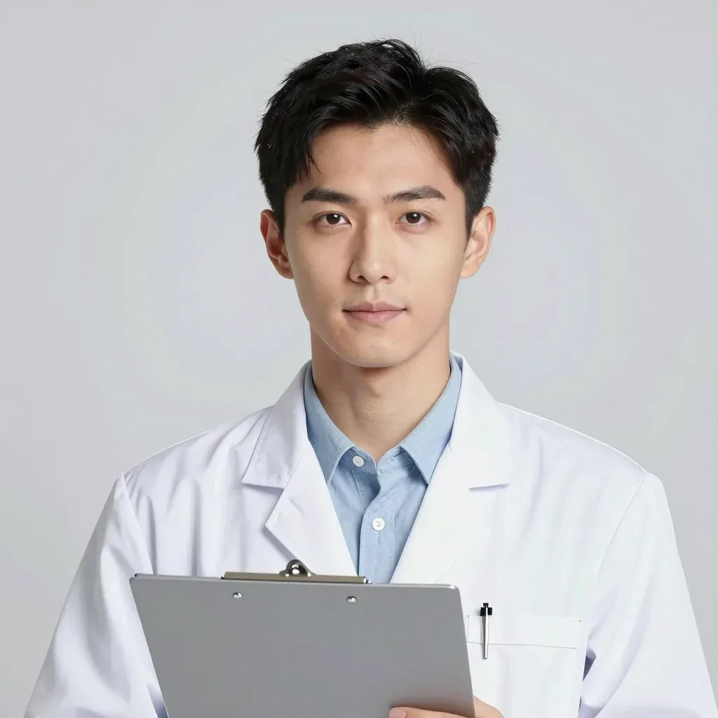 A young individual in a white lab coat holds a clipboard, with soft, even lighting highlighting the subject's face and lab coat. The neutral gray background provides a clean and distraction-free backdrop.