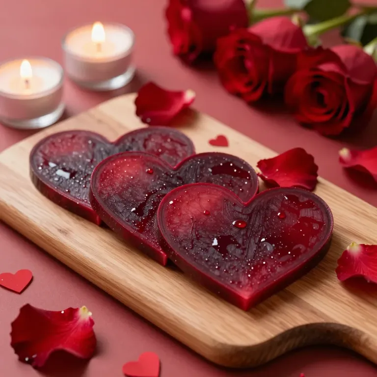 Three glossy heart-shaped beetroot slices rest on a wooden cutting board, their deep crimson surfaces glistening with moisture under warm candlelight. The shallow depth of field and soft-focus background with scattered rose petals and lit candles create a romantic, intimate composition with layered depth.