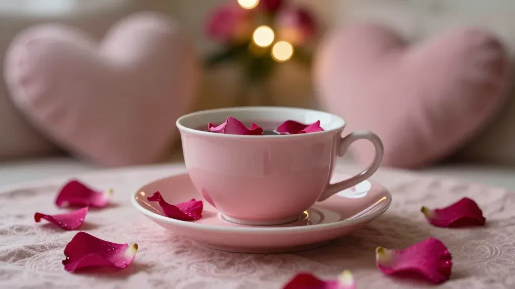 A close-up of a porcelain teacup and saucer adorned with rose petals, set against a backdrop of heart-shaped pillows and a vase of more petals, bathed in diffused, soft light that highlights the glossy surface of the teacup. The shallow depth of field creates a cozy, romantic atmosphere with ample copy space.