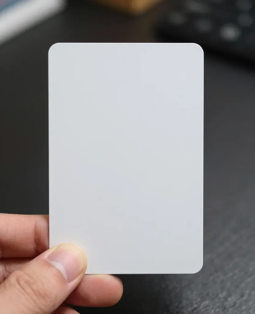 A hand delicately grips a translucent card, showcasing its smooth edges and slightly glossy surface under soft, diffused lighting. The shallow depth of field blurs the dark, textured background, emphasizing the card's delicate texture and the hand's gentle hold.
