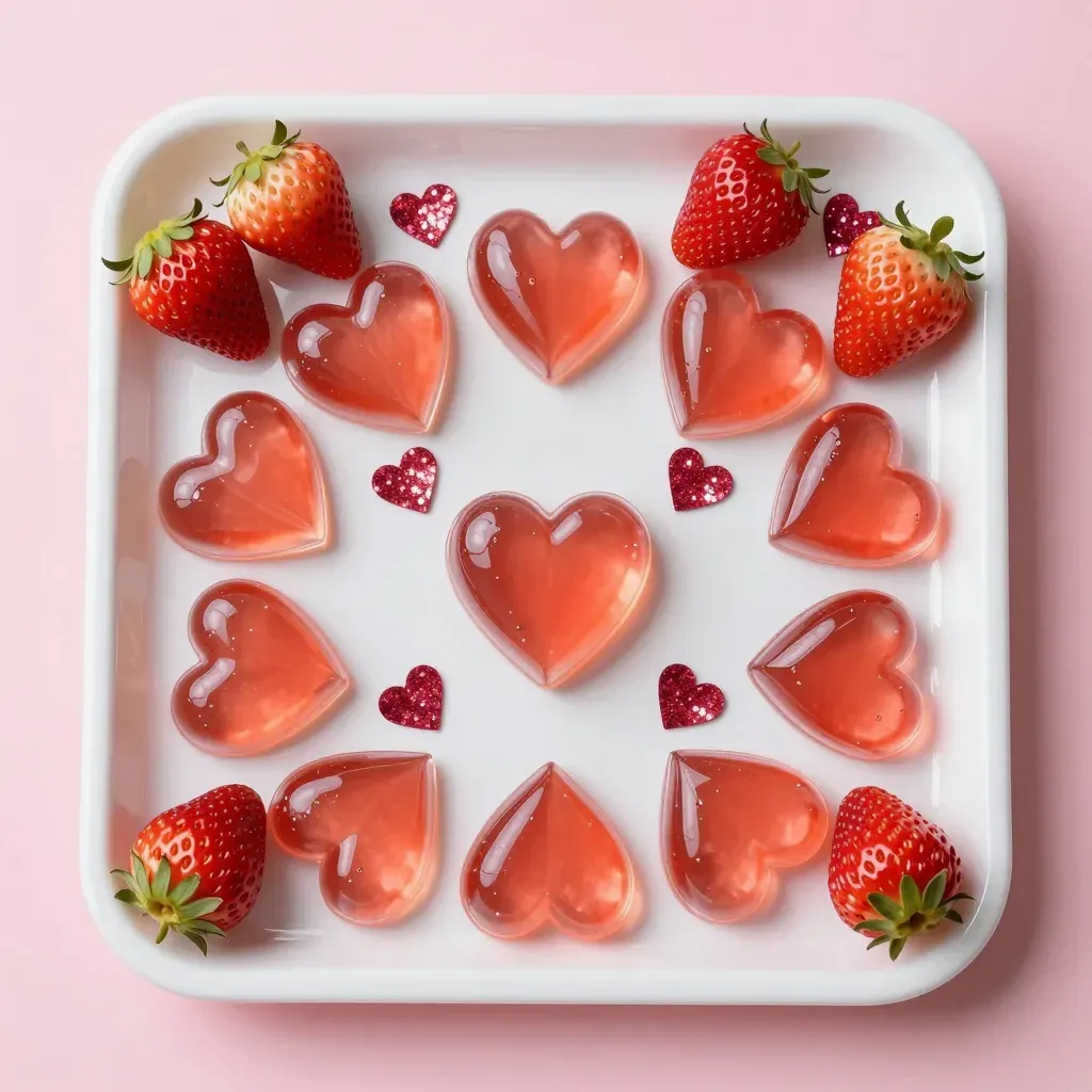 Heart-shaped gelatin molds arranged in a circular pattern with strawberries, showcasing a smooth, translucent texture and vibrant colors under soft, diffused lighting. The pale pink background enhances the visual appeal and provides ample copy space.
