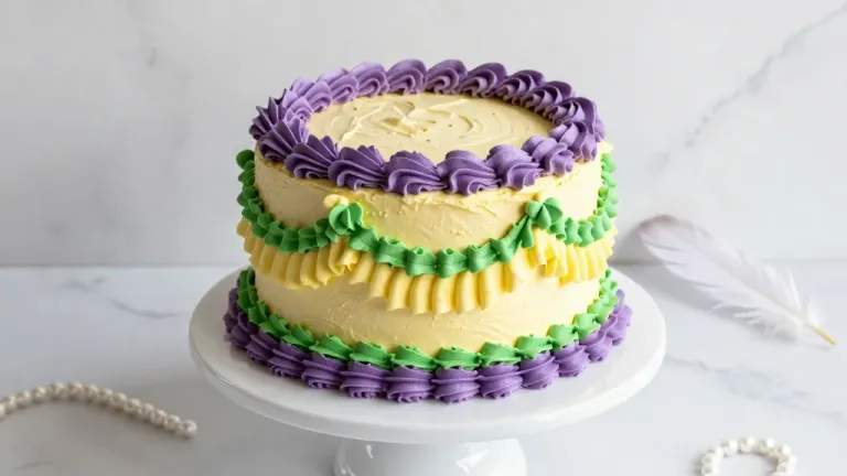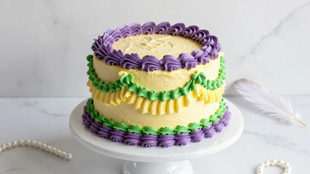 A beautifully frosted buttercream ruffle cake with intricate purple and green accents, set against a soft, diffused light that highlights its glossy texture. The clean white marble background and shallow depth of field emphasize the cake as the focal point, making it ideal for culinary and food photography.