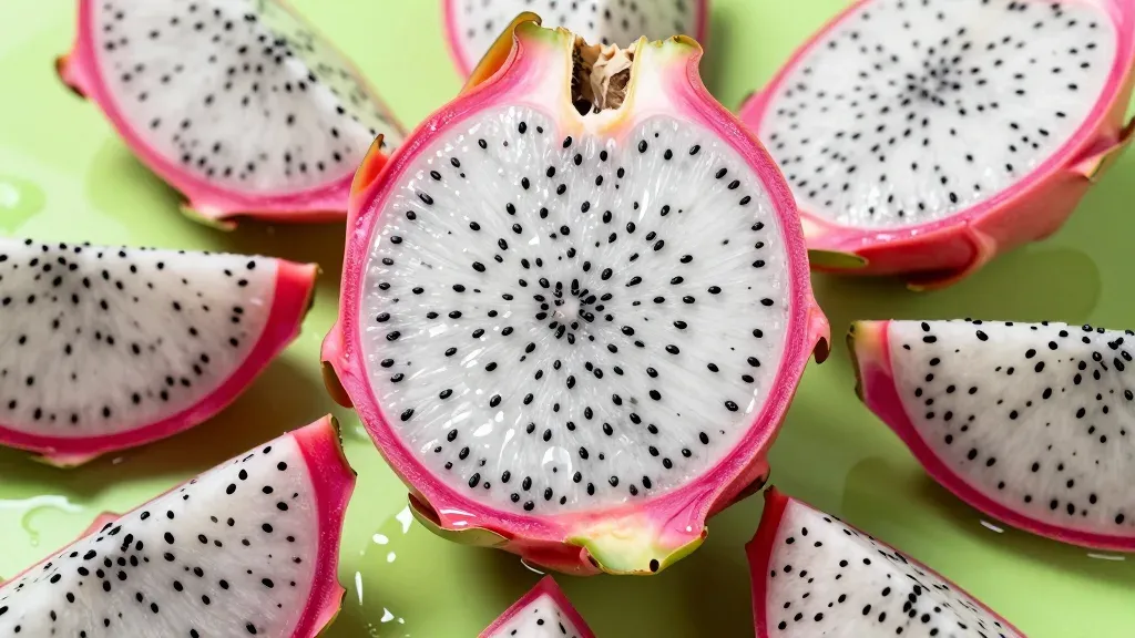 Juicy dragon fruit slices with glossy, soft flesh and rough, vibrant rind, softly lit from above, creating a dynamic, almost floating effect against a clean green background.