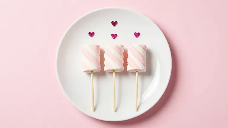 Soft, glossy pink marshmallows on wooden skewers, arranged on a white plate with red hearts, set against a clean pink background. The diffused lighting highlights the marshmallows' texture, creating a balanced and inviting composition.