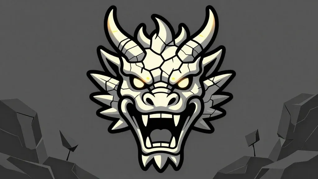 A menacing, skeletal dragon face with glossy, cracked, and angular textures, highlighted by dim, ambient lighting that emphasizes its features against a dark, rocky background. The composition draws the viewer's focus to the central dragon face, creating a sense of depth and mystery.