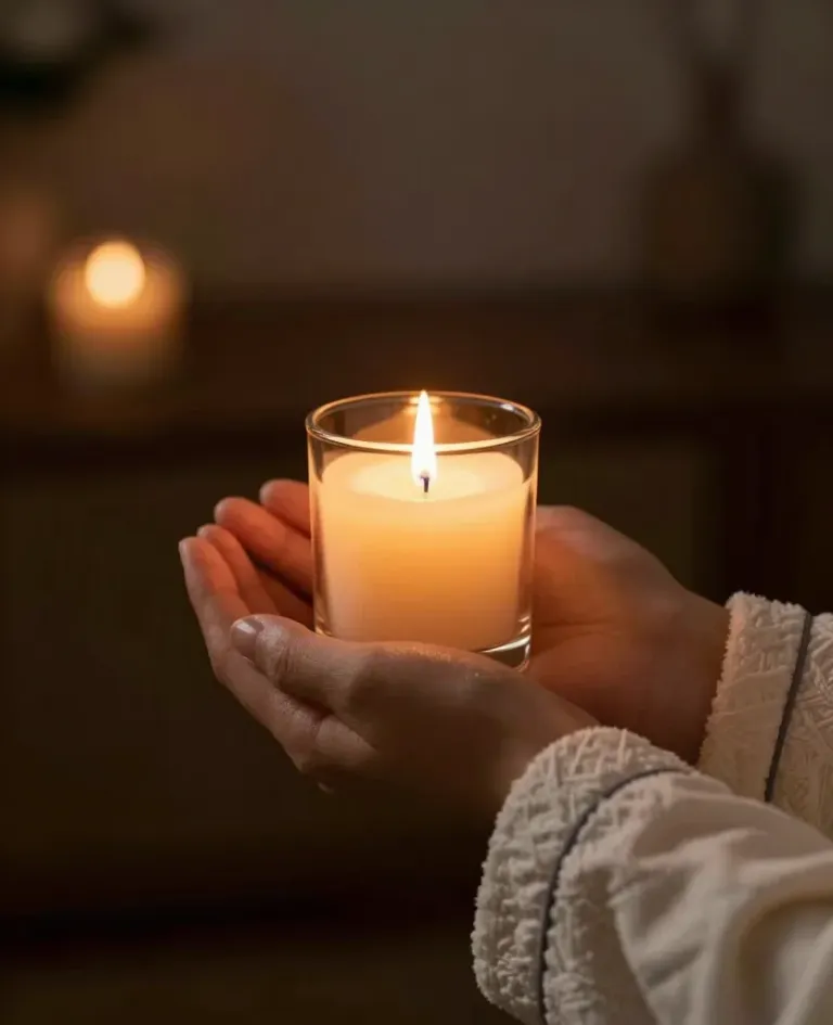 A pair of hands gently cradle a lit candle in a clear glass, casting a warm, soft glow. The shallow depth of field blurs the background, focusing attention on the intimate, serene moment.