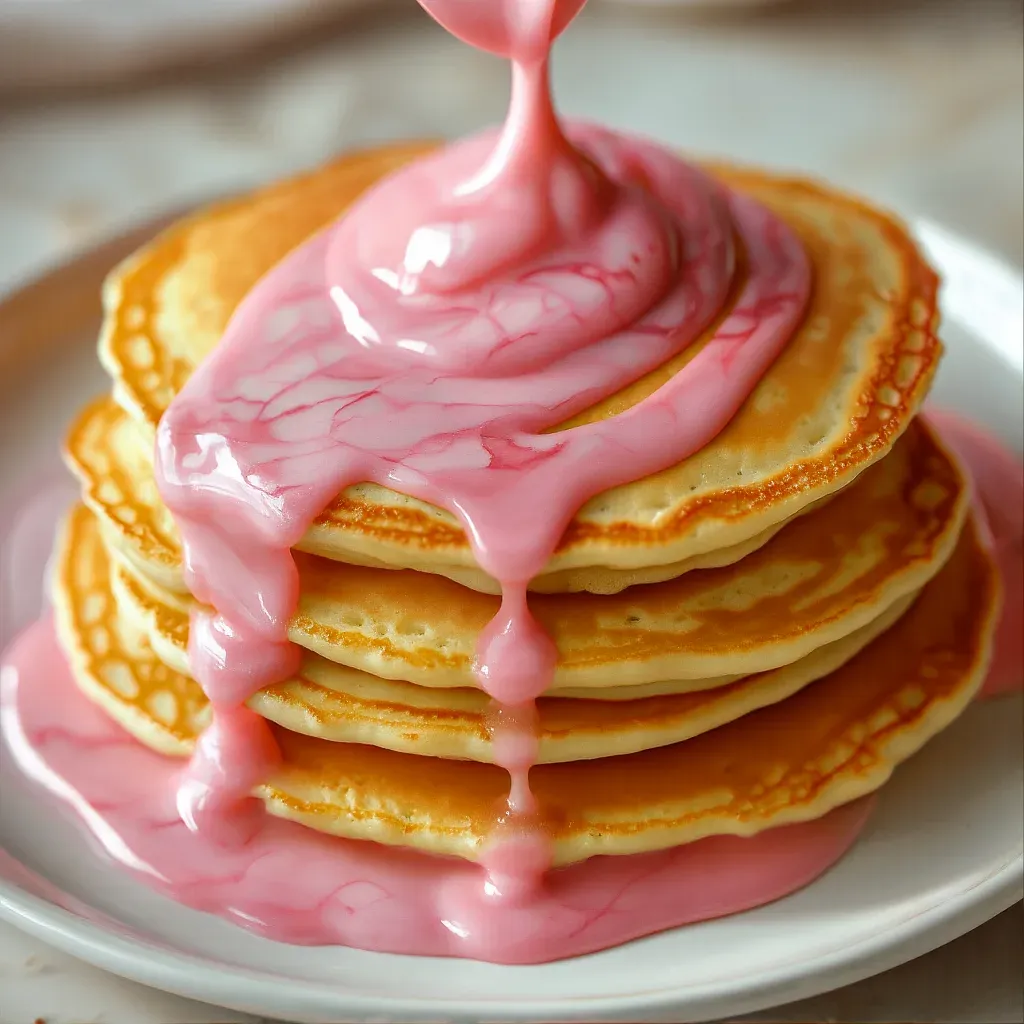 A stack of golden pancakes is being drizzled with a glossy, bright pink sauce, creating a visually striking contrast. The bright, direct lighting highlights the glossy texture of the sauce and the golden hue of the pancakes, while the blurred background ensures the focus remains on the delicious treat.