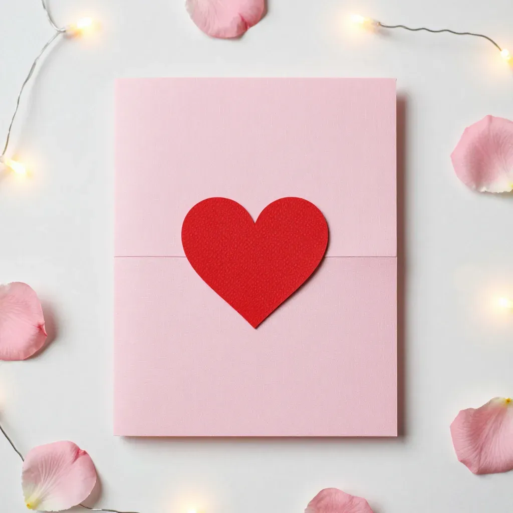 A pink gift card featuring a matte red heart is arranged in a flat lay with warm golden fairy lights and scattered rose petals, creating a soft, romantic ambiance. The composition offers ample copy space for text, making it ideal for greeting cards or promotional materials.