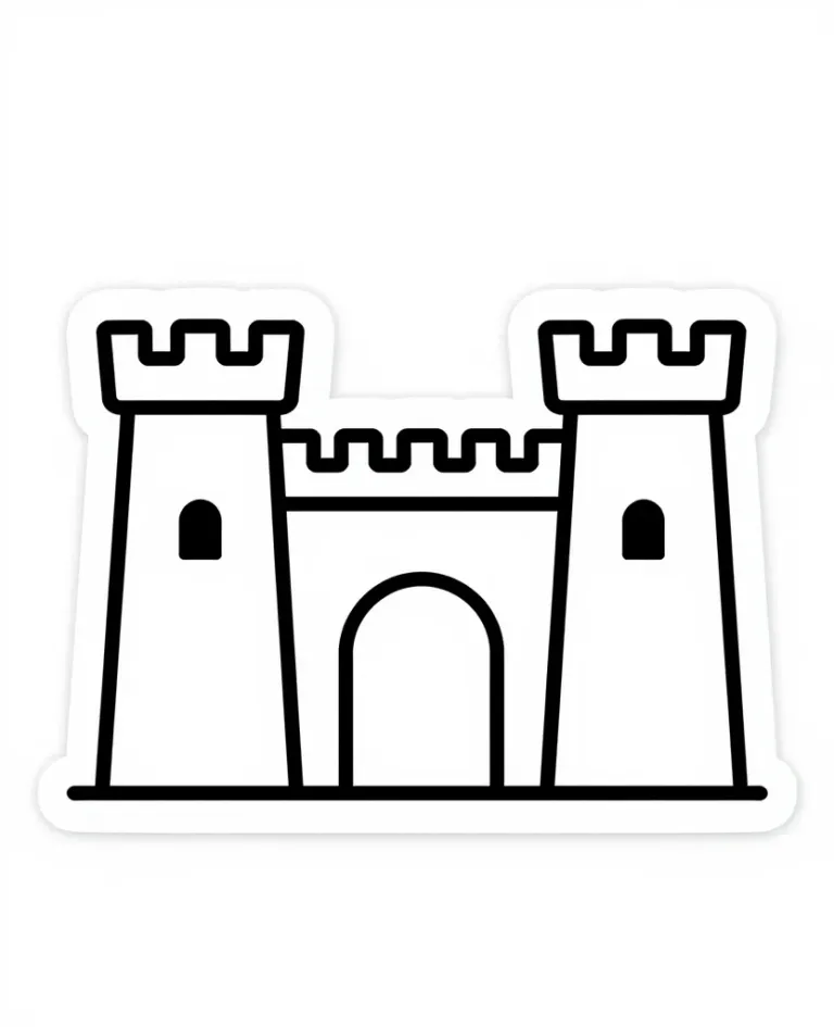 A minimalist black line illustration of a castle featuring two symmetrical towers and a central arched gateway, rendered in a clean, graphic style. The image is presented with uniform flat lighting and a seamless white background, emphasizing its use as a standalone icon or design element.