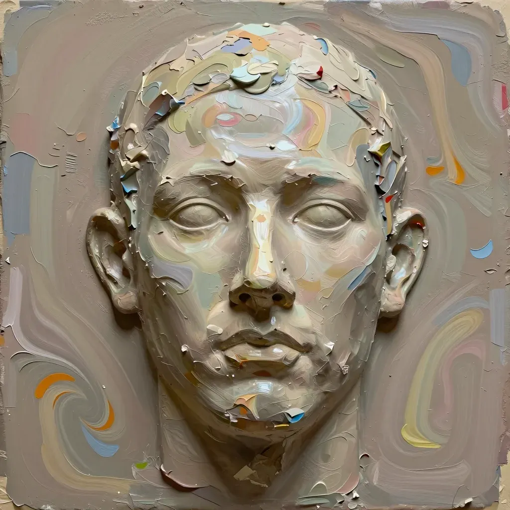 A detailed impasto portrait of a face, bathed in warm directional light, highlighting the textured, layered paint. The shallow depth of field and abstract, blurred background add depth and focus to the subject.