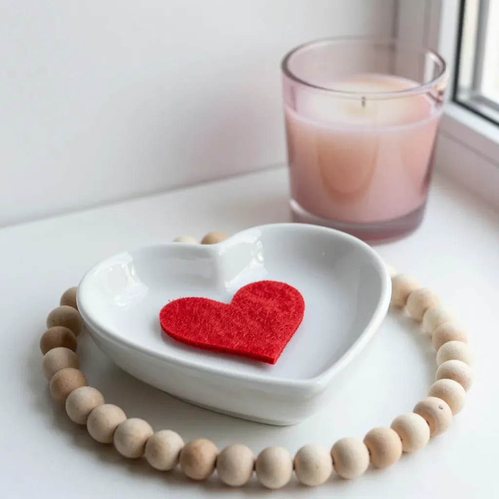 A glossy white ceramic dish shaped like a heart holds a deep red felt heart, encircled by smooth natural wood beads, with a blush pink candle in the background. Soft natural daylight from the right creates gentle highlights on the ceramic and glass, while a shallow depth of field isolates the subject against a clean white surface with blurred window edge.