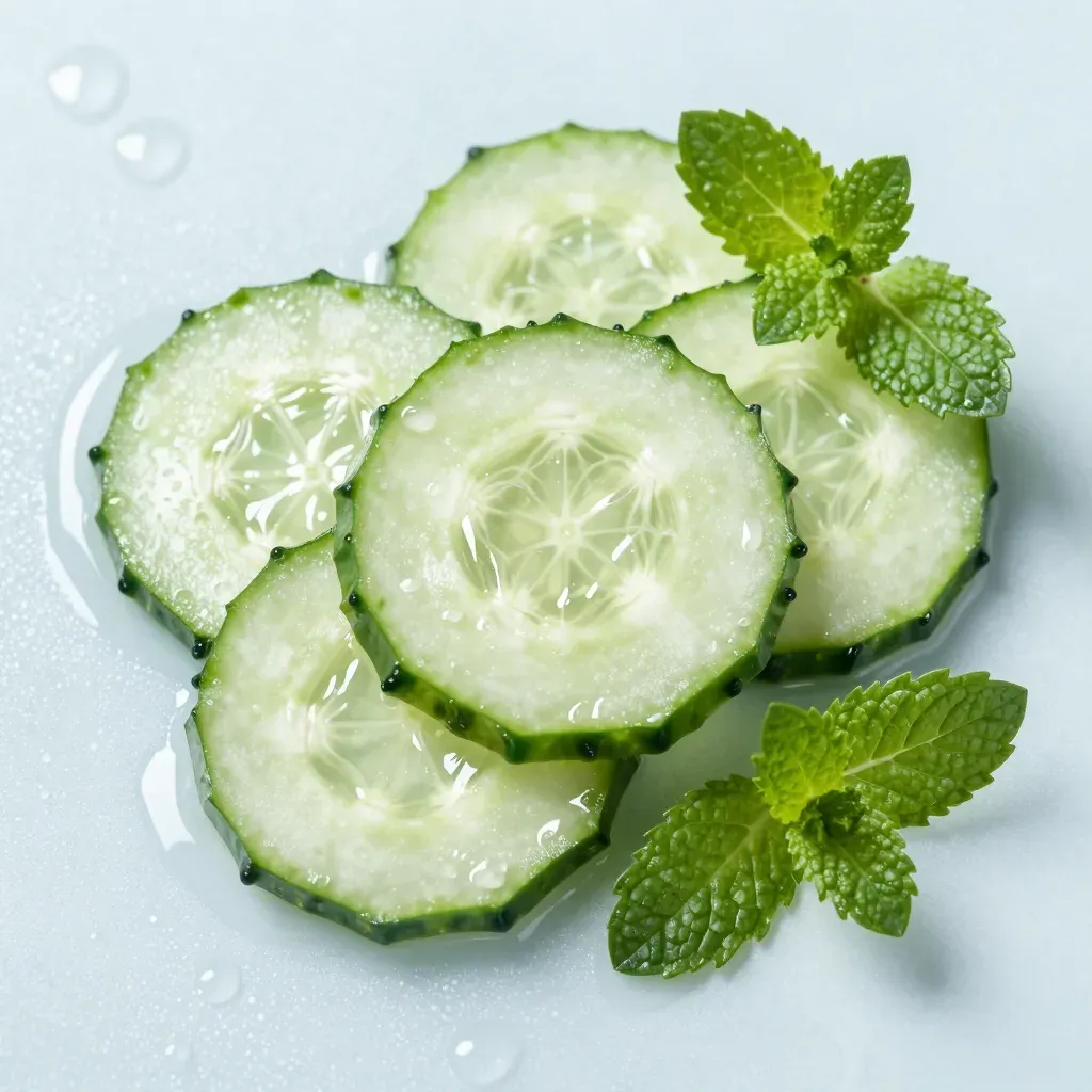Freshly sliced cucumbers and vibrant mint leaves arranged in a circular pattern, illuminated by soft, diffused light that highlights their textures and colors, set against a plain, light-colored background with a shallow depth of field.
