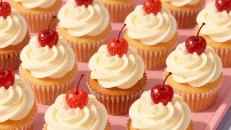 A close-up of cupcakes with smooth, glossy white frosting and shiny red cherries, softly lit from above, creating gentle shadows and highlights. The blurred pink background keeps the focus on the cupcakes, providing ample copy space for design elements.
