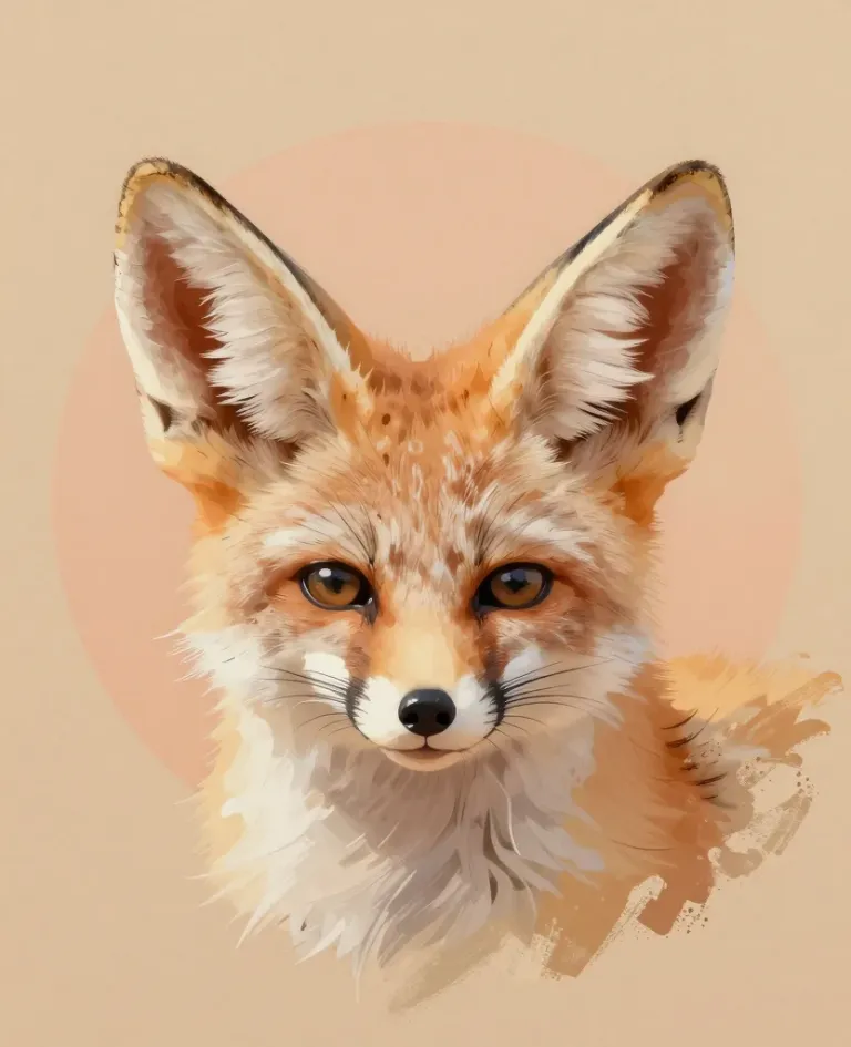A close-up of a fennec fox face with soft, fluffy fur and amber eyes, illuminated by warm, golden light. The shallow depth of field and soft peach background provide a gentle, serene backdrop.