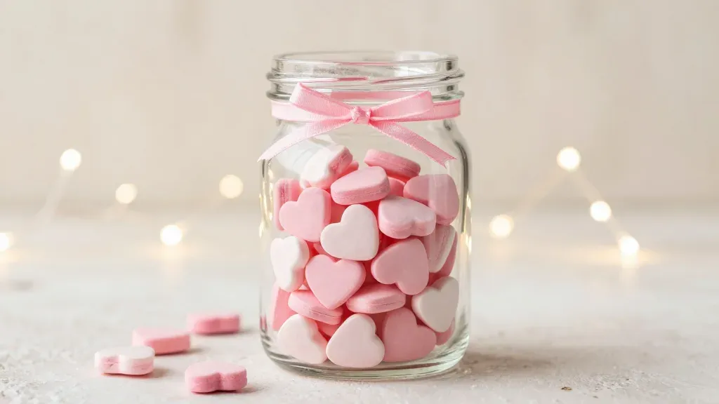 A glass jar filled with pink and white heart-shaped candies, tied with a pink ribbon, set against a soft, diffused light background that creates a dreamy, romantic atmosphere. The balanced composition and warm lighting make this image perfect for Valentine's Day or romantic themes.