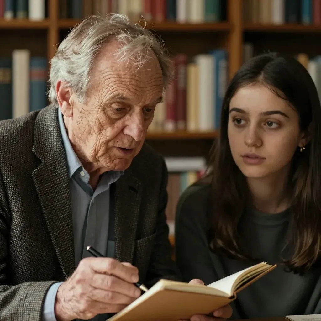 An elderly man writes in a leather-bound notebook while a young woman listens attentively, illuminated by warm, directional light. The intimate framing and shallow depth of field emphasize the subjects against the blurred bookshelves filled with books.