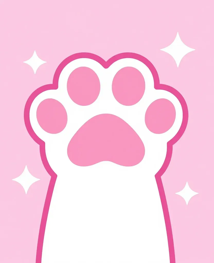 A glossy, smooth paw pad with four distinct pads and a central pad, illuminated by soft, diffused light from above, creating gentle highlights. The paw pad is centered and symmetrical, with a shallow depth of field against a soft pink background adorned with subtle sparkles, emphasizing the paw pad.