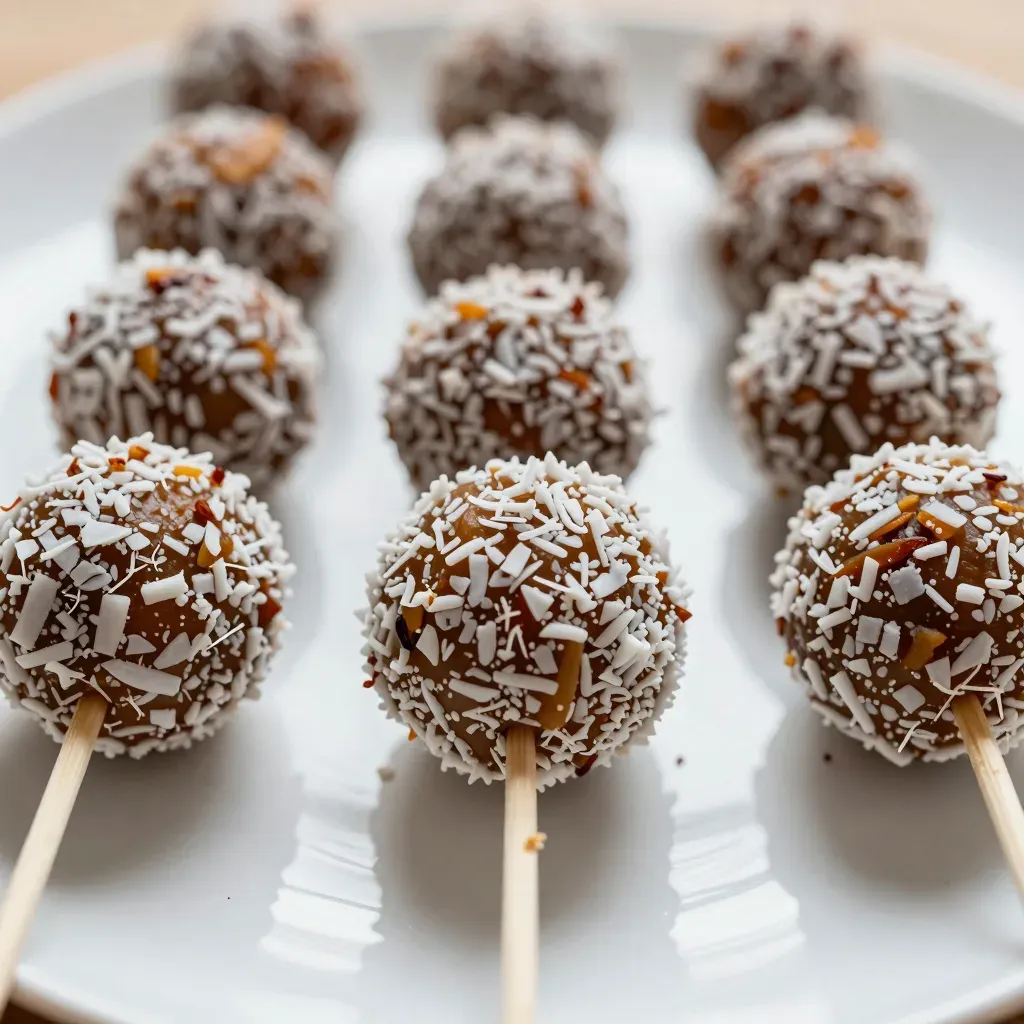 Neatly arranged coconut-date rolls on skewers, coated in smooth, glossy chocolate, with a soft and moist date filling, crunchy coconut flakes, and a slight roughness from orange zest, under soft, diffused light that creates a warm and inviting atmosphere. The clean white plate background ensures the subject stands out without distraction.