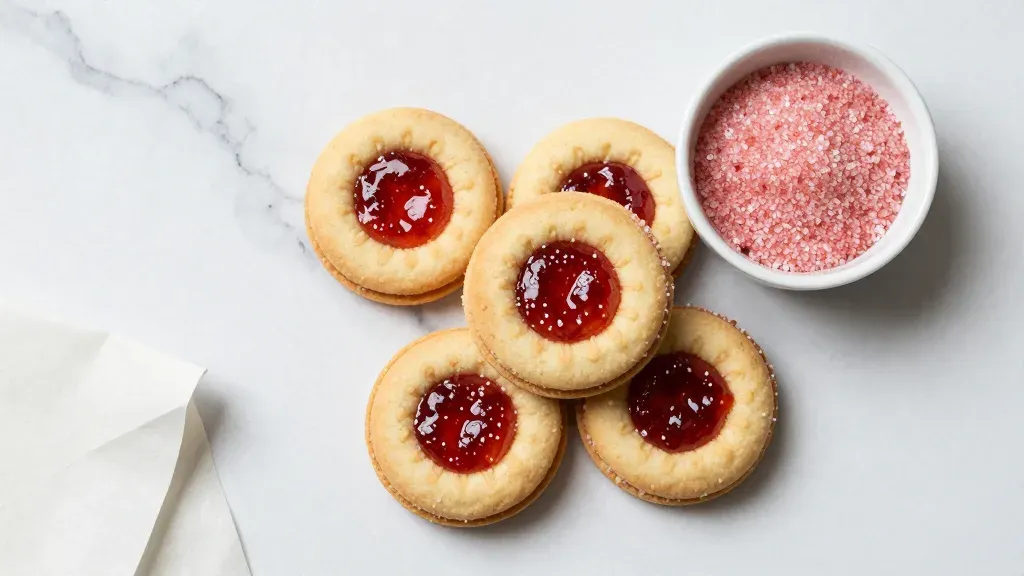 Soft, buttery raspberry thumbprint cookies with glossy jam filling and crunchy sugar coating, captured in a close-up shot with soft, diffused lighting that highlights the glossy jam and sugar, set against a minimal white marble background that emphasizes the cookies.