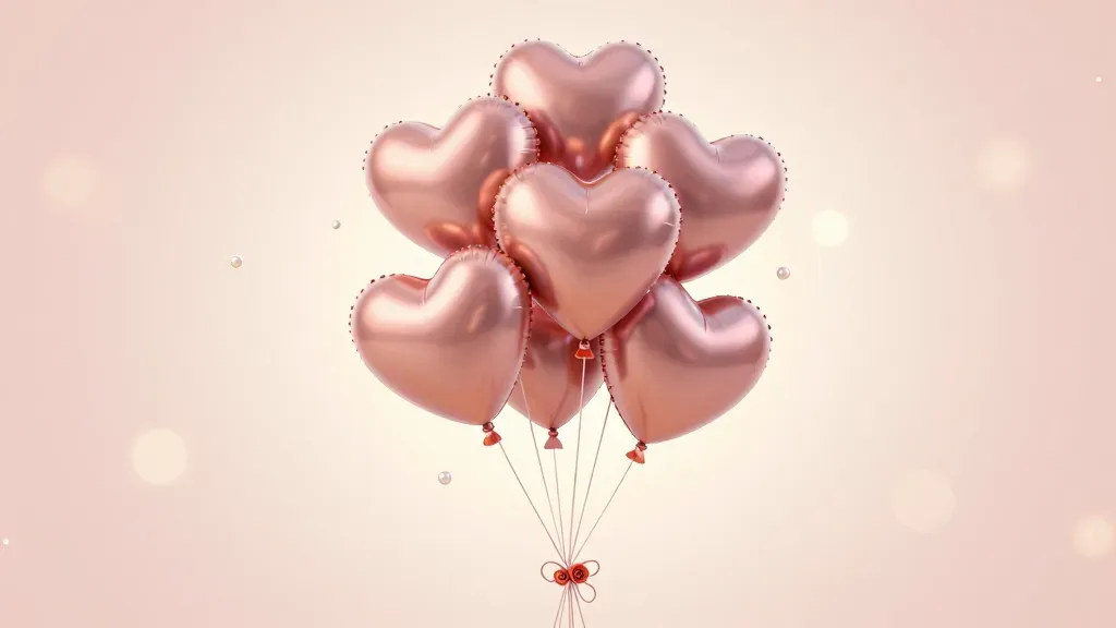 A cluster of glossy, rose gold heart-shaped balloons gently illuminated by soft, diffused light, creating a romantic and elegant atmosphere. The blurred pastel bokeh background enhances the focus on the balloons, making it ideal for wedding or Valentine's Day themes.