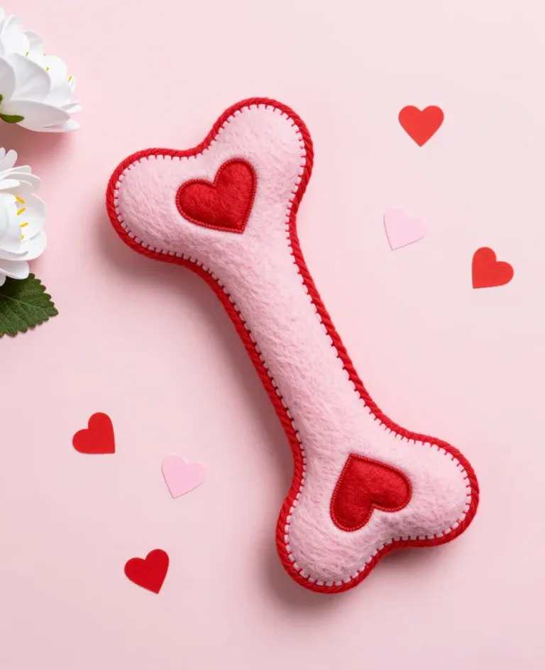 A handcrafted pink felt dog bone adorned with two red heart appliqués and fine red embroidery, resting on a soft blush surface with scattered hearts and white roses. The image features soft diffused lighting, shallow depth of field, and a diagonal composition with ample copy space around the central subject.