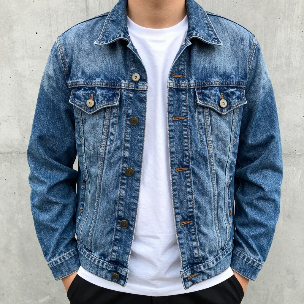 A model wears a worn-in denim jacket over a white t-shirt, illuminated by soft, diffused light that creates gentle shadows and reflections. The neutral concrete wall background provides a clean, industrial setting with ample copy space.