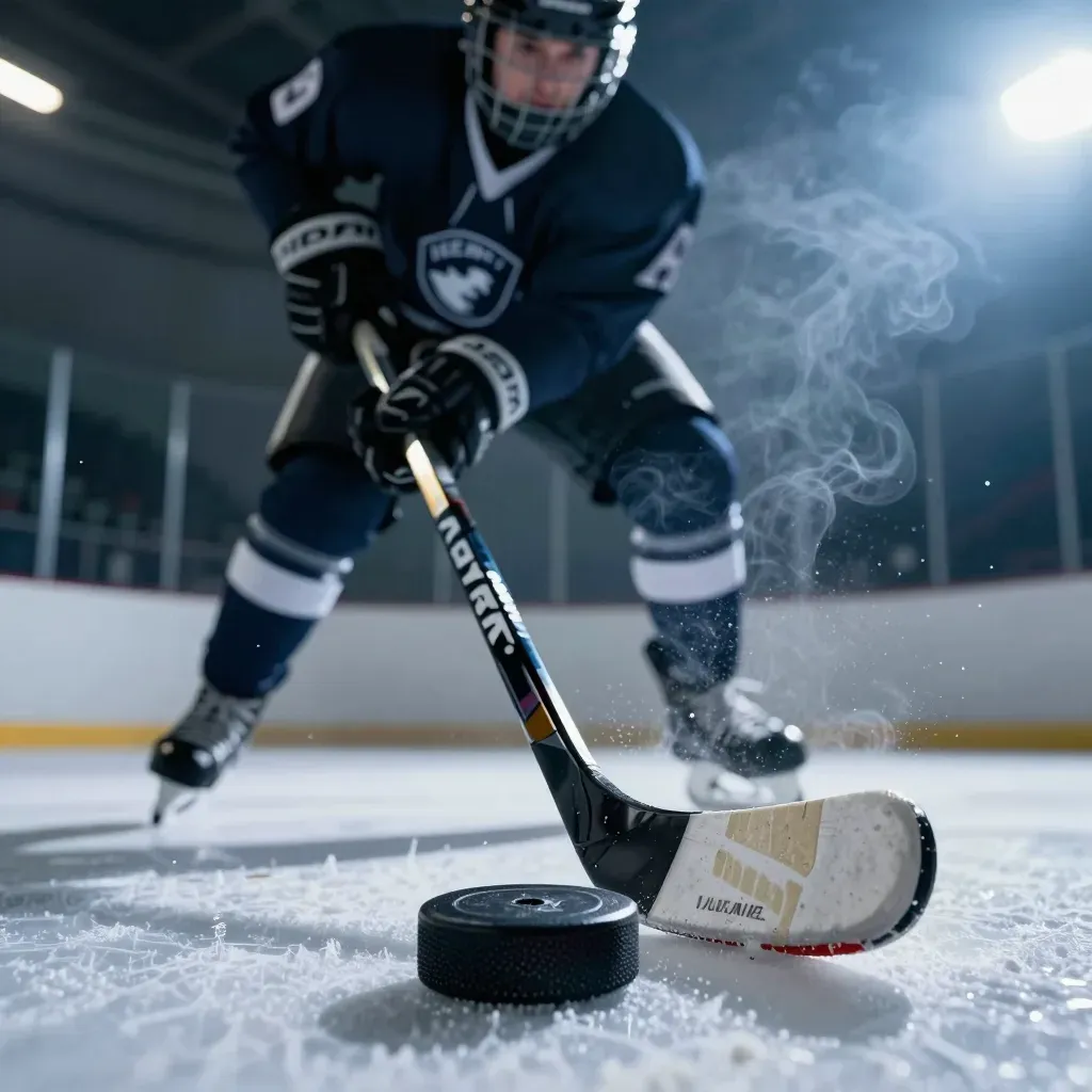A focused hockey player in a dark blue uniform controls the puck with a glossy stick, set against a bright arena with smoke rising from the ice. The low angle and shallow depth of field emphasize the player's skill and the dynamic motion of the scene.