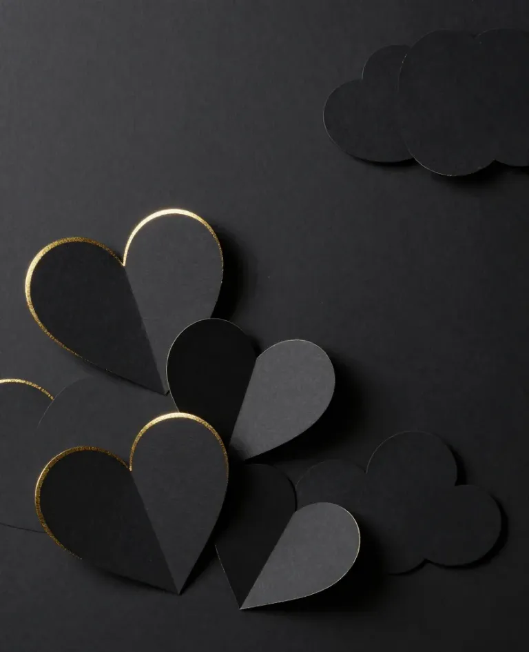 Glossy black hearts with gold outlines cluster together, creating a sense of unity and focus against a matte black background. Soft, diffused light highlights the gold outlines and casts gentle shadows, emphasizing the texture and depth of the hearts.