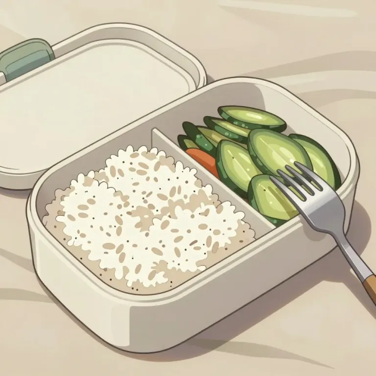 A close-up of a bento box containing glossy rice and crisp cucumber slices, illuminated by soft, diffused light from above, creating gentle highlights and shadows. The shallow depth of field keeps the focus on the bento box, with a blurred beige background.