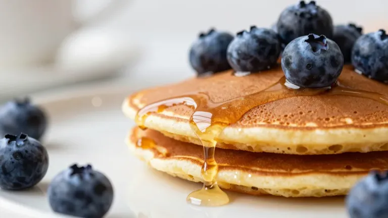 Two golden pancakes topped with fresh blueberries and amber syrup, with syrup dripping down the sides, showcasing a soft porous texture and glossy sheen. Soft diffused lighting from the upper left creates gentle highlights on the berries and syrup, while shallow depth of field isolates the stack against a blurred off-white background.