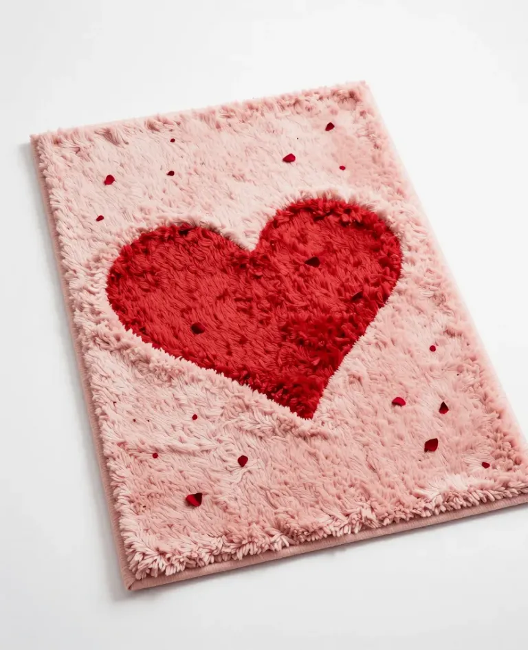 A plush pink throw rug adorned with a glossy red heart accent, softly lit to highlight its texture and vibrant colors. Clean white background ensures the rug is the focal point, ideal for interior design and home decor.