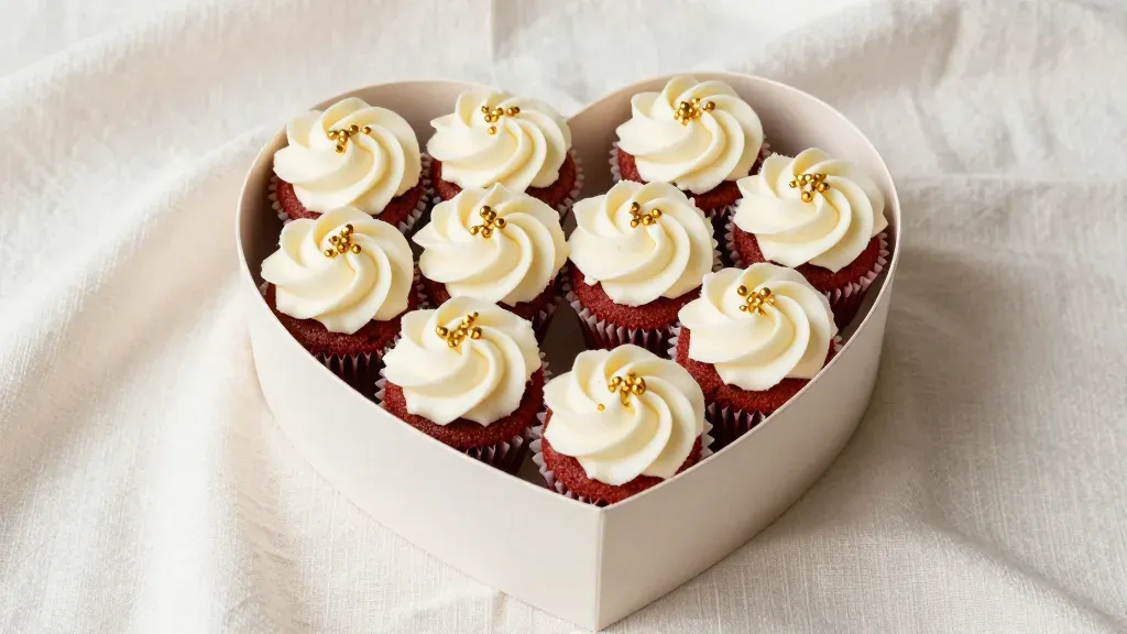 A heart-shaped box filled with red velvet cupcakes, each topped with smooth white frosting and delicate gold leaf, bathed in soft, warm directional light from above, creating gentle shadows against a blurred white fabric background. The close-up view highlights the texture and arrangement of the cupcakes, offering a clean and elegant backdrop for design elements.