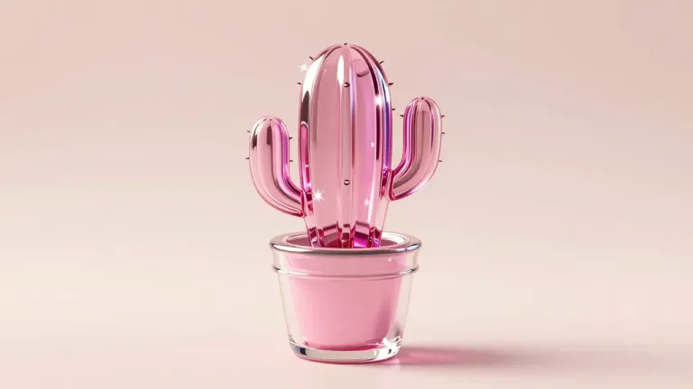 A glossy metallic pink cactus sits in a smooth glass pot, illuminated by soft, diffused light that creates highlights and reflections, set against a pale, pastel-colored, blurred background. The composition is centered with the cactus slightly off-center to the left, creating a balanced yet dynamic feel.