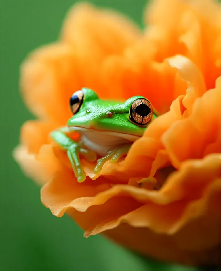 A glossy green frog rests on vibrant orange ruffled petals, illuminated by soft, diffused light that highlights its features and the delicate texture of the petals. The deep green background is blurred, drawing focus to the subject and creating a shallow depth of field.