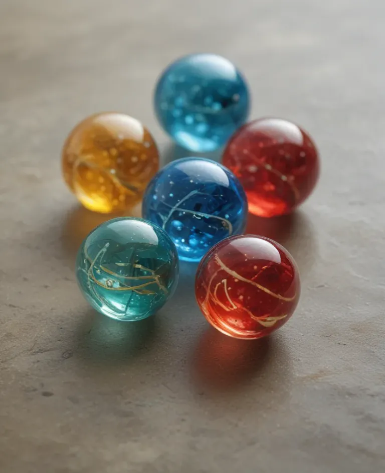 Six glossy glass marbles in amber, blue, and red hues, with white internal patterns, are arranged in a centered gradient on a smooth gray concrete surface, softly illuminated from above, creating highlights and reflections that emphasize their translucent quality and vibrant colors.