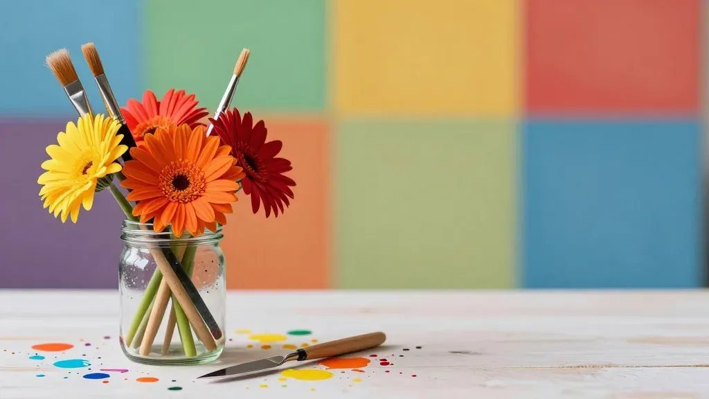 A vibrant bouquet of gerbera daisies in a glass jar, accompanied by wooden pencils and a palette knife, set against a soft pastel background. The diffused lighting highlights the glossy texture of the glass and the soft petals of the flowers, creating a cheerful and artistic atmosphere.